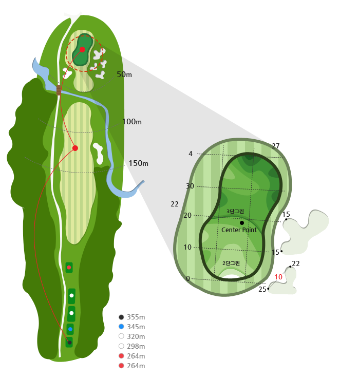 280Y 지점에 크리크가 있고 그린이 약간 포대그린으로 2단이기 때문에 핀위치에 따라 신중한 공략이 필요합니다.